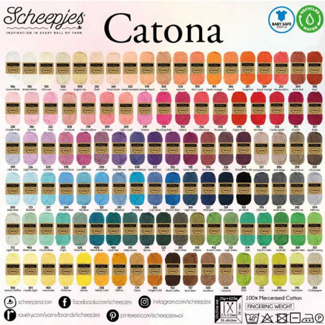 Catona é um fio 100% algodão. É mercerizado e, por isso, possui um brilho subtil e suave ao toque. Ideal para peles sensíveis, tem a marca de qualidade EN71-3. Durante a produção foi utilizado tratamento de águas residuais totalmente biológico, para que a água utilizada seja reciclada e reutilizada de forma segura. Disponível em 113 cores é o fio ideal para Amigurumi, roupas e acessórios, como malas, bolsas e almofadas. Pode ser utilizado com o fio da mesma marca, Glow Up, que brilha no escuro, ou outros fios da mesma categoria.
